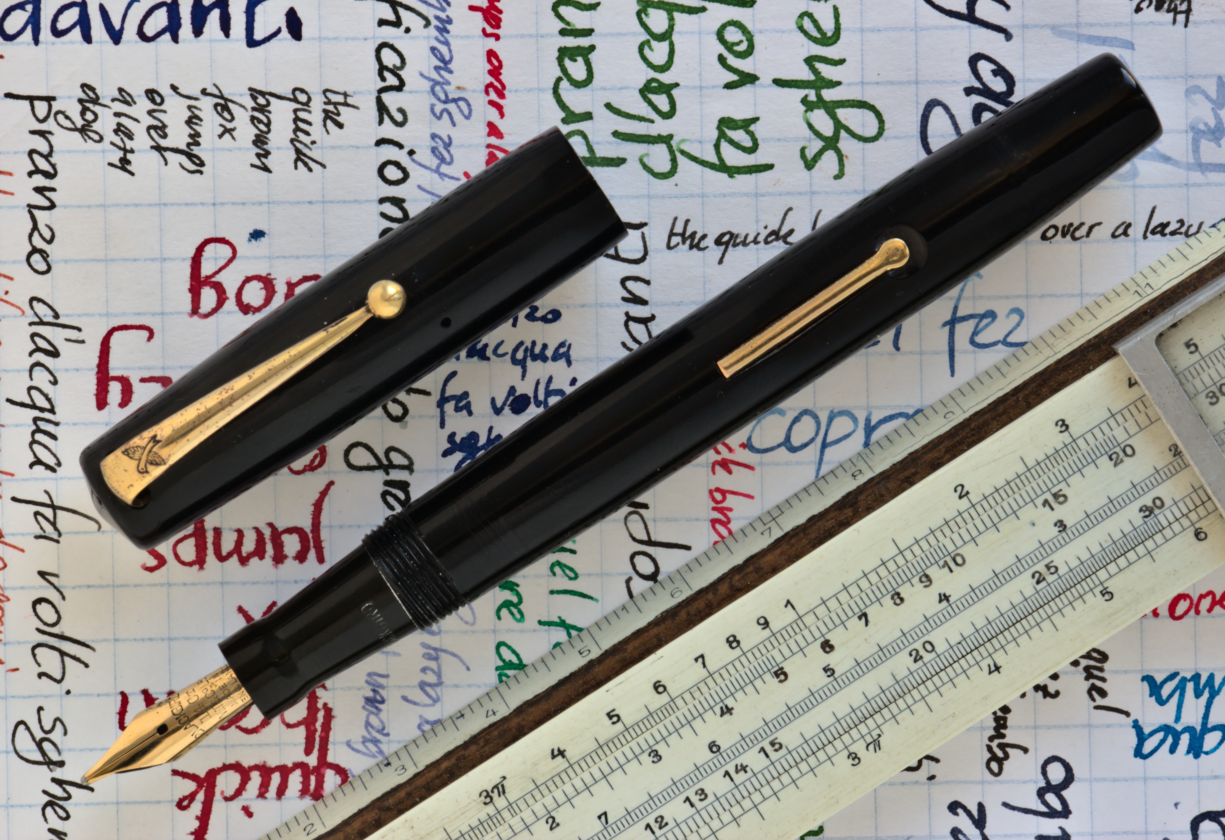 Foto di una penna Blackbird (sottomarca Swan). Modello: Blackbird 5260. Caricamento a levetta. Realizzazione in celluloide nera. Modello del dopoguerra, numerazione che indica pennino di dimensione 2 e penna in celluloide nera.