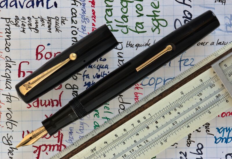 Photo of a pen produced by Blackbird (sub-band of Swan). Model: Blackbird 5260. Filling system: lever filler. In black celluloid. Post war model, numbering for #2 nib and black celluloide pen.