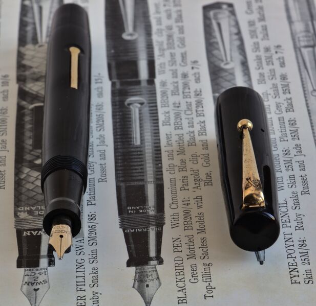 Foto di una penna Blackbird (sottomarca Swan). Modello: Blackbird 5260. Caricamento a levetta. Realizzazione in celluloide nera. Modello del dopoguerra, numerazione che indica pennino di dimensione 2 e penna in celluloide nera.