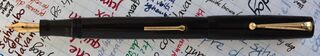 Foto di una penna Blackbird (sottomarca Swan). Modello: Blackbird 5260. Caricamento a levetta. Realizzazione in celluloide nera. Modello del dopoguerra, numerazione che indica pennino di dimensione 2 e penna in celluloide nera.
