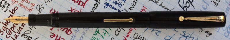 Photo of a pen produced by Blackbird (sub-band of Swan). Model: Blackbird 5260. Filling system: lever filler. In black celluloid. Post war model, numbering for #2 nib and black celluloide pen.