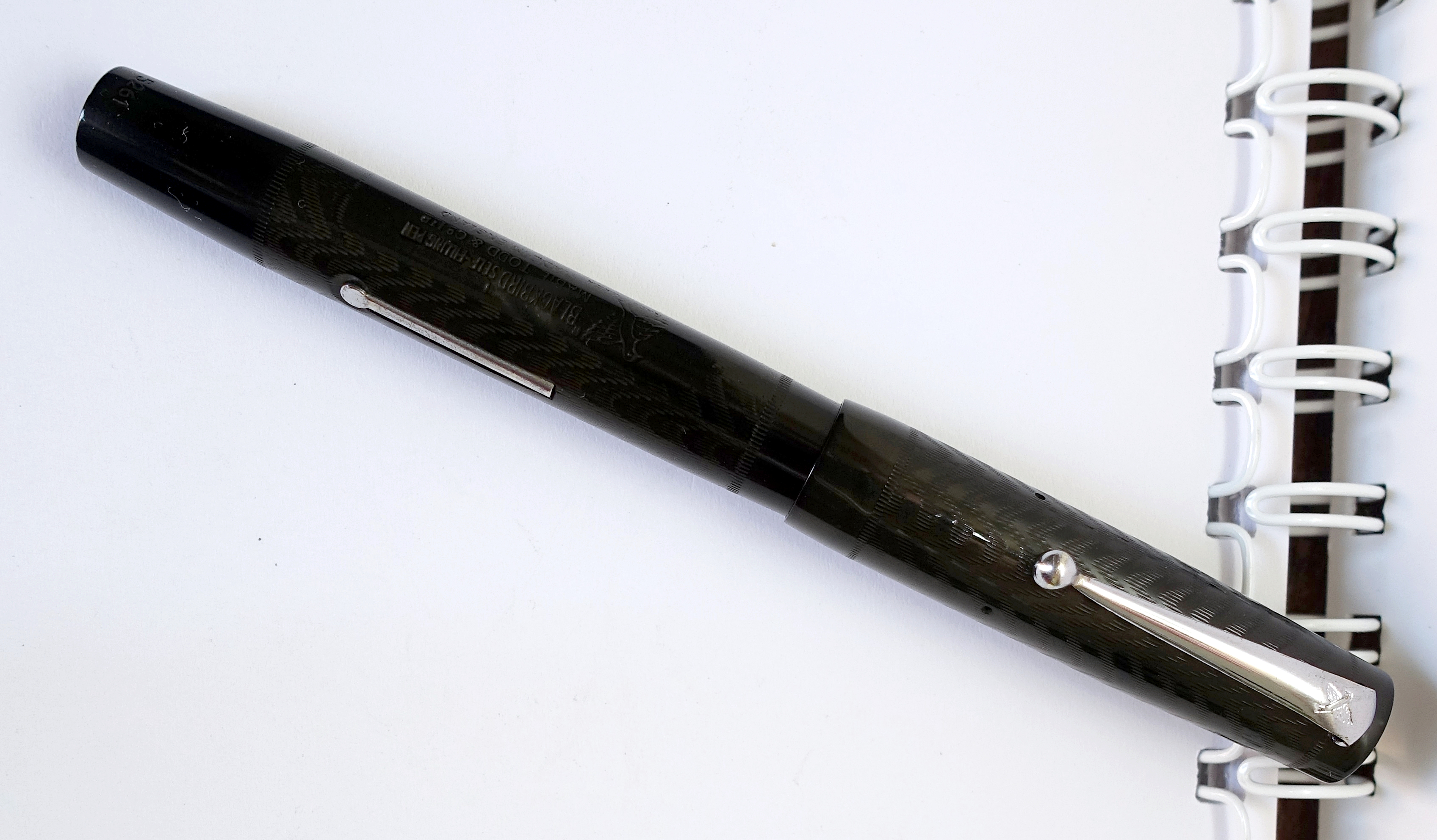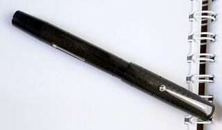 Foto di una penna Blackbird (sottomarca Swan). Modello: Blackbird 5261. Caricamento a levetta. Realizzazione in ebanite nera. Modello del dopoguerra, numerazione che indica pennino di dimensione 2 e penna in ebanite nera. Contributo di Linos (utente forum Linos).