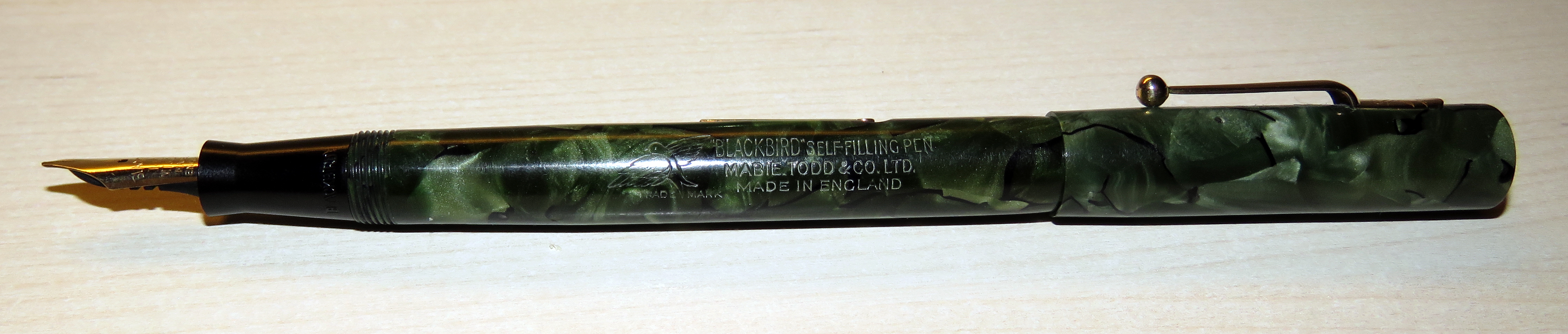 Foto di una penna Blackbird (sottomarca Swan). Modello: Blackbird BB 2. Caricamento a levetta. Realizzazione in celluloide verde marmorizzato. Versione più antica, con clip a cima piatta, marcata "Self-Filling" e codice di colore (62 o G2?) atipico. Contributo di Luca (utente forum lucawm).