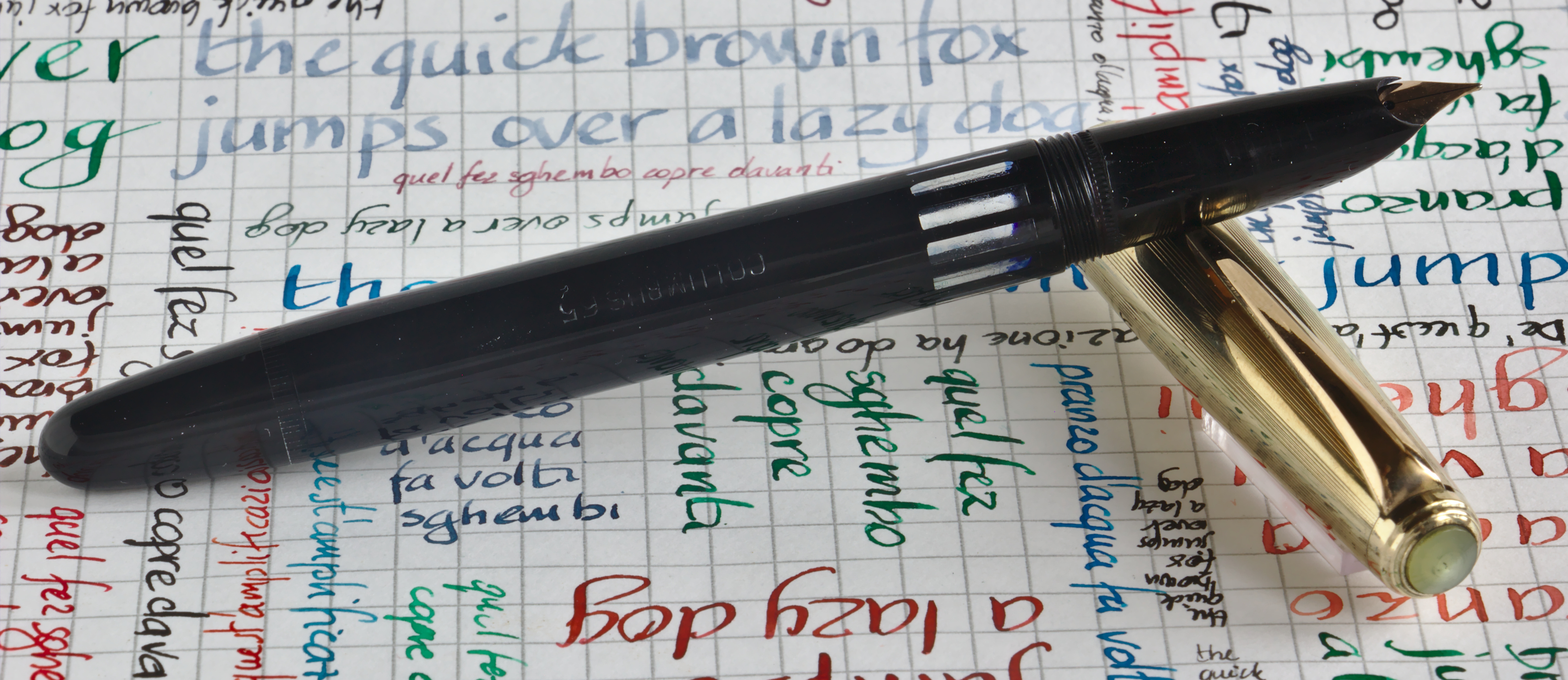Foto di una penna Columbus. Modello: Columbus 65. Caricamento a stantuffo. Realizzazione in resina plastica nera. Modello a pennino carenato e cappuccio laminato.