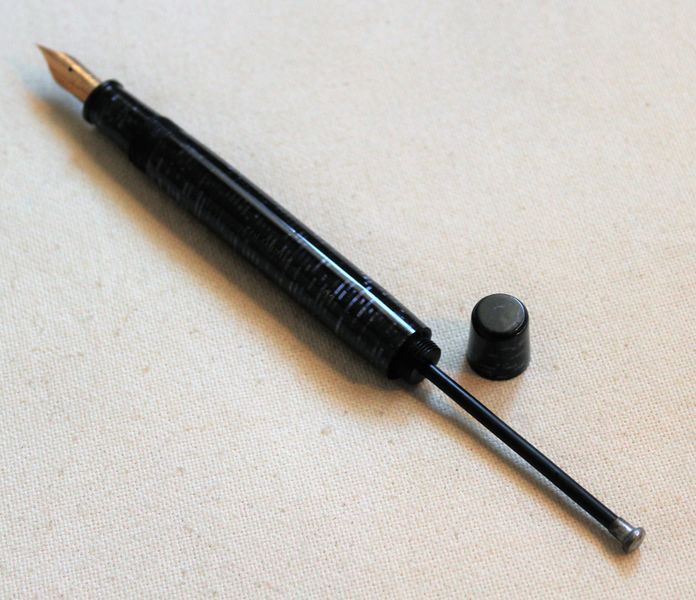 Photo of a pen produced by Columbus. Model: Columbus Extra 102. Filling system: plunger filler. In blue ringed celluloid.