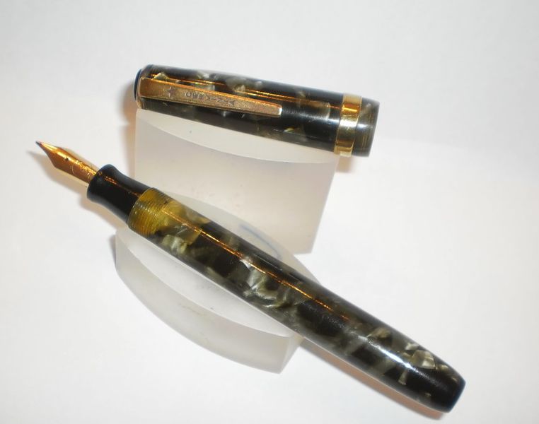 Foto di una penna Cervinia. Modello: Cervinia 57. Caricamento a pulsante di fondo. Realizzazione in celluloide marmorizzata grigia. Contributo di Fabrizio Falchi, (utente forum fountainpen.it fab66).