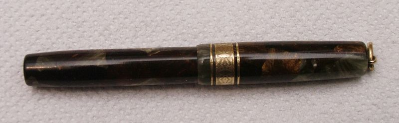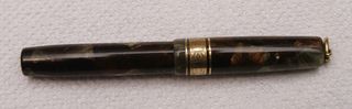 Photo of a pen produced by Columbus. Model: Columbus Extra N. 80. Filling system: spoon filler. In marbled gray/bronze celluloid. Probably an earlier model, with machined band on the cap.