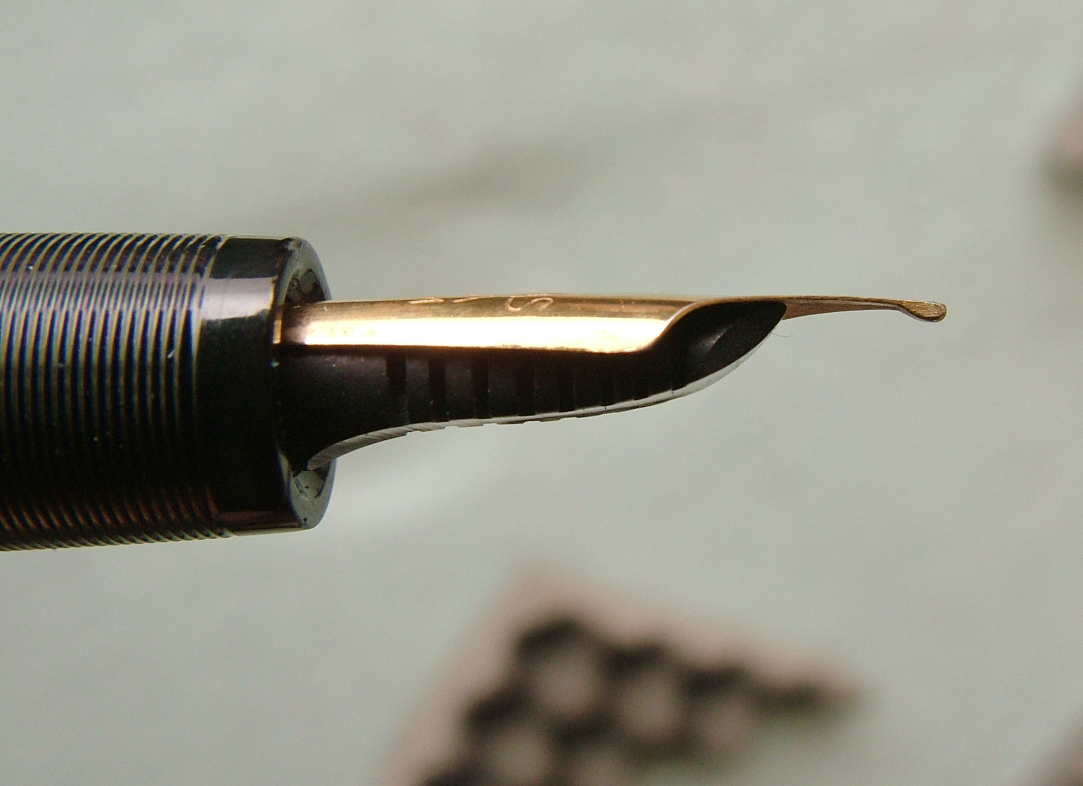 Foto di una penna Contessa. Caricamento a levetta. Realizzazione in ebanite nera. Dettaglio dell'alimentatore. Dettaglio del pennino. Modello ignoto con cappuccio a banda large e pennino non originale. Contributo di Massimo (utente forum maxpop55).