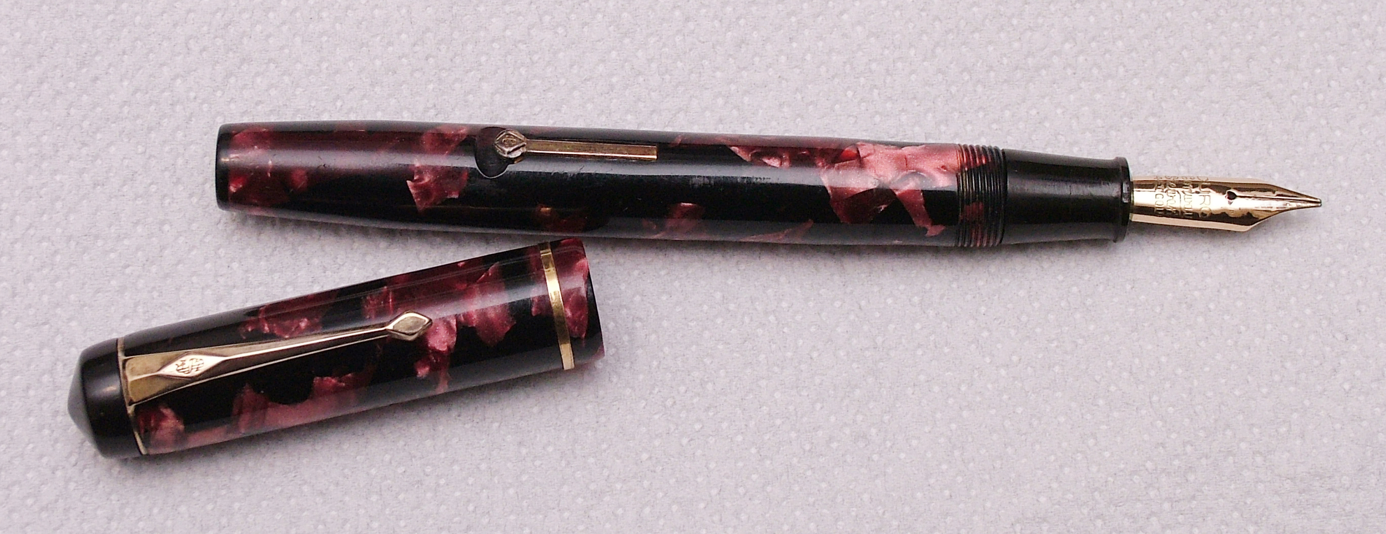 Photo of a pen produced by Conway Stewart. Model: Conway Stewart 45. Filling system: lever filler. In red marbled celluloid.