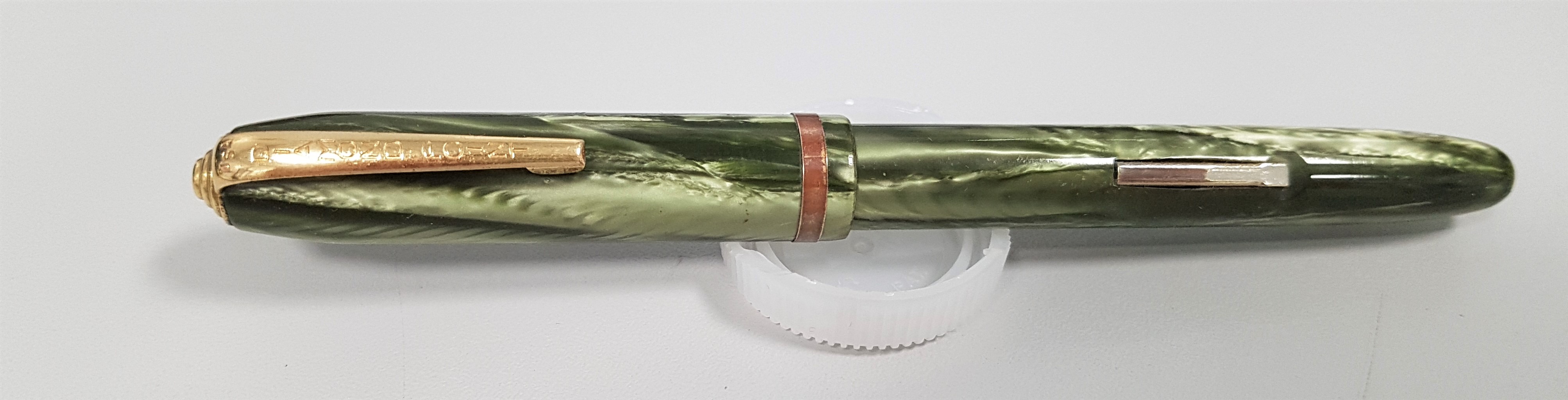 Photo of a pen produced by Diamond. Filling system: lever filler. In striated green celluloid. Unknown model.