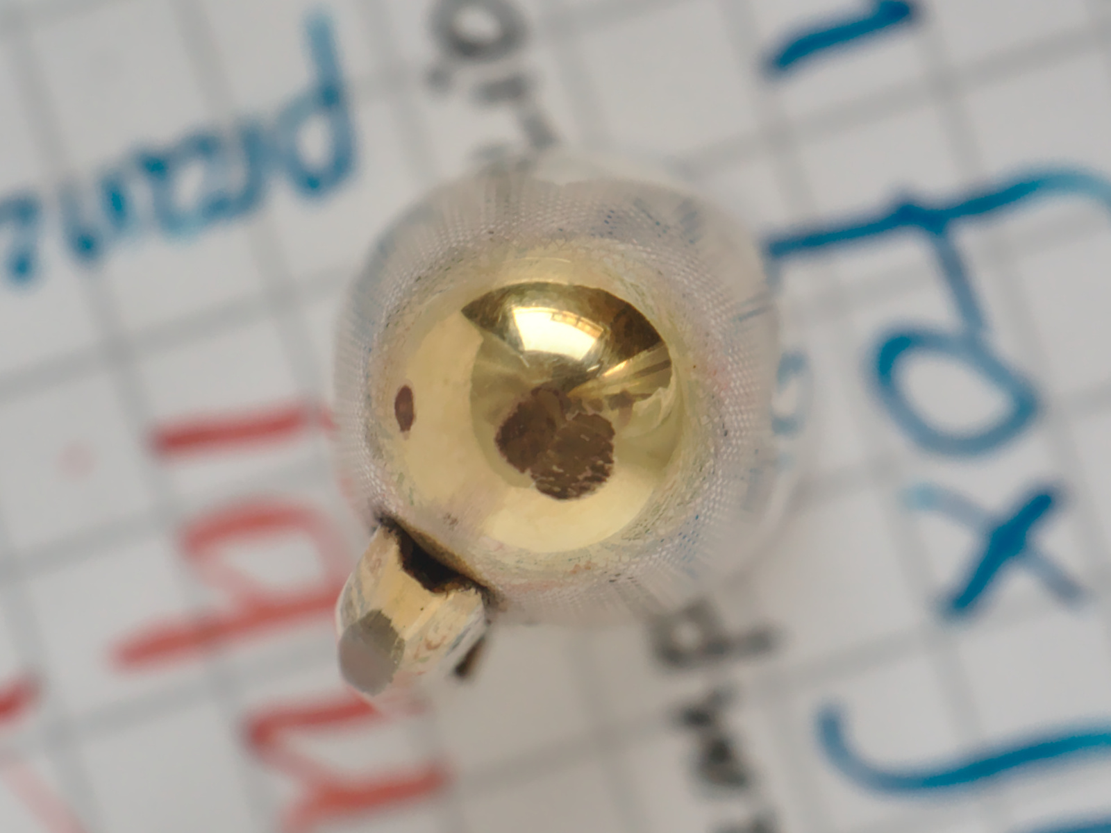 Photo of a pen produced by Europa. Filling system: piston filler. With a geometric pattern gold rolled overlay. Detail of cap head. Postwar production, with celluloid body and hooded nib.