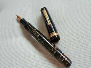 Foto di una penna Helios marcata "Helios - Silga". Caricamento a stantuffo. Realizzazione in celluloide anellata. Modello non identificato, ispirato a una Vacumatic, riconducibile alla produzione italiana della Silga. Contributo di Fabrizio Falchi, (utente forum fountainpen.it fab66).
