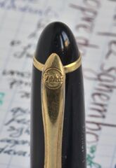 Photo of a pen produced by Geha. Model: Geha 700. Filling system: piston filler. In black plastic resin. Detail of clip. Scholastic model marked as "Geha-Schulfüller". With a special mechanims to activate an ink reserve (see patent nº GB-666830); inprinted "MIT RESERVETANK".