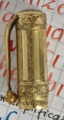 Foto di una penna Invicta. Caricamento rientrante. Realizzazione con rivestimento laminato con pannelli alternati di onde e lisci ed anelli cesellati. Dettaglio del cappuccio. Dettaglio della stampigliatura. Pennino "WARRANTED" "14 CT" "1ST QUALITY", doratura marcata 18 "K.R." sul bordo cappuccio.