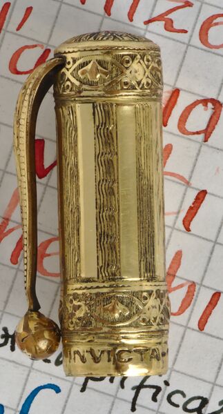 attuale23:13, 20 mag 2020Miniatura della versione delle 23:13, 20 mag 20201 400 × 2 600 (2,78 MB)Piccardi (discussione | contributi){{PhotoInfo |Marca=Invicta |Oggetto=pen |Particolare=cap,inscr |Caricamento=safety |Materiale=overlay |MatDesc_it=con pannelli alternati di onde e lisci ed anelli cesellati |MatDesc_en=with alternating of waved and smooth panels and chiseled rings |Lic...