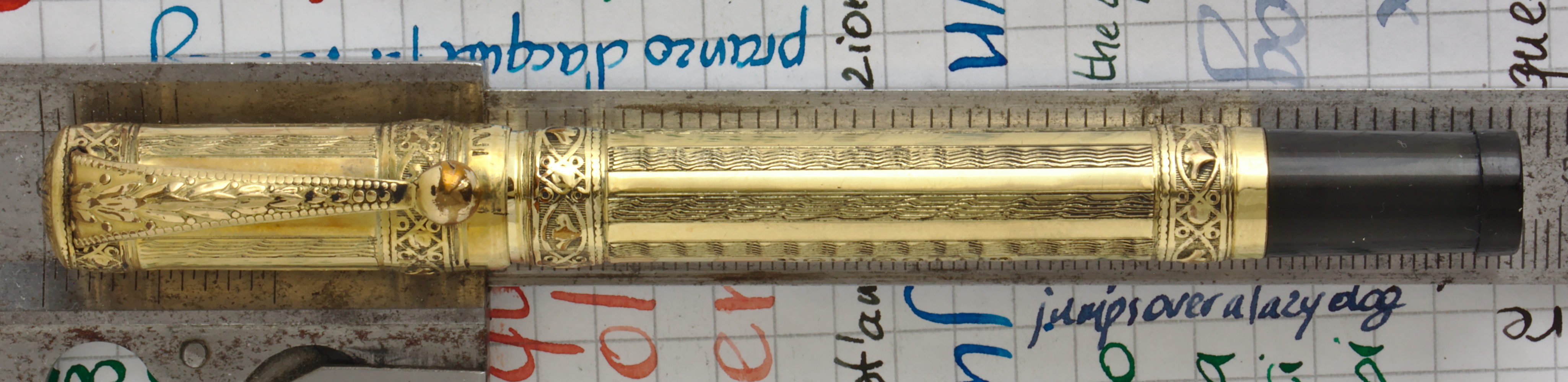 Photo of a pen produced by Invicta. Filling system: safety. With with alternating of waved and smooth panels and chiseled rings gold rolled overlay. "WARRANTED" "14 CT" "1ST QUALITY" nib, gilding marked 18 "K.R." on the cap lip.