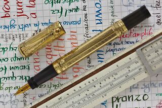 Photo of a pen produced by Invicta. Filling system: safety. With with alternating of waved and smooth panels and chiseled rings gold rolled overlay. "WARRANTED" "14 CT" "1ST QUALITY" nib, gilding marked 18 "K.R." on the cap lip.