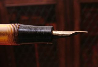 Foto di una penna Imperial. Modello: Imperial Privat. Caricamento a stantuffo. Realizzazione in celluloide nera e marmorizzata verde. Rara versione con corpo colorato. Penino non originale. Contributo di Massimo (utente forum maxpop55).