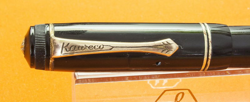 Foto di una penna Kaweco. Modello: Dia 90. Caricamento a stantuffo. Realizzazione in celluloide nera. Dettaglio del cappuccio. Contributo di muristenes (utente forum muristenes).