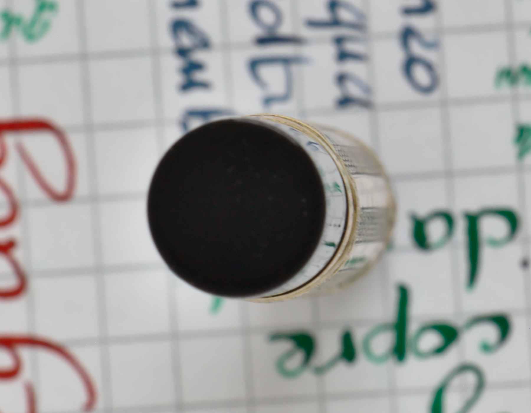 Photo of a pen produced by Invicta. Filling system: safety. With with alternating of waved and smooth panels and chiseled rings gold rolled overlay. Detail of bottom. "WARRANTED" "14 CT" "1ST QUALITY" nib, gilding marked 18 "K.R." on the cap lip.