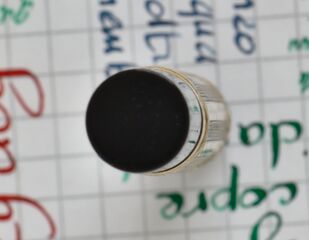 Foto di una penna Invicta. Caricamento rientrante. Realizzazione con rivestimento laminato con pannelli alternati di onde e lisci ed anelli cesellati. Dettaglio del fondo. Pennino "WARRANTED" "14 CT" "1ST QUALITY", doratura marcata 18 "K.R." sul bordo cappuccio.