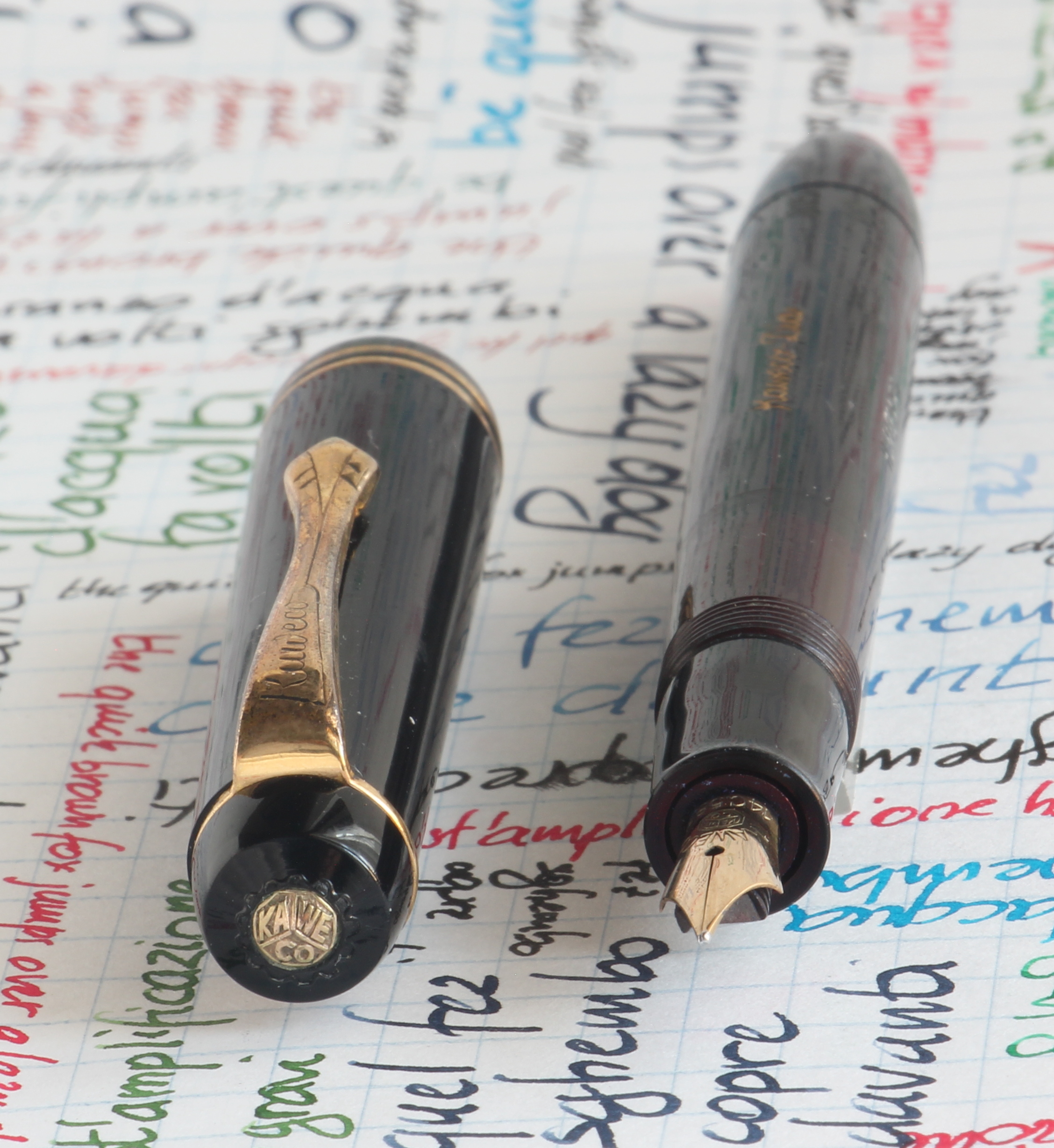 Foto di una penna Kaweco. Modello: Dia 805. Caricamento a stantuffo. Realizzazione in resina plastica nera. Marcata per pennino "08" (F obliquo).