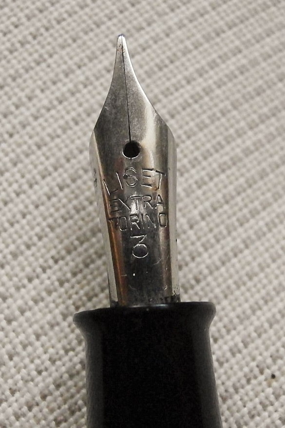 Foto di una penna Liset. Caricamento a pulsante di fondo. Realizzazione in celluloide striata marrone. Dettaglio del pennino. Modello ignoto, con fermaglio a rotellina. Contributo di Fabrizio Falchi, (utente forum fountainpen.it fab66).