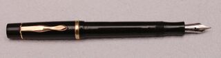 Photo of a pen produced by Montblanc marked "Meisterstück". Model: Montblanc 134. Filling system: piston filler. In black celluloid. Standard wartime version with steel nib.