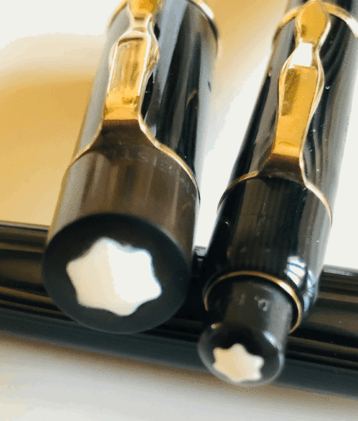 Photo of a pen/pencil set produced by Montblanc. Model: Montblanc 126. Filling system: button filler. In Platinum (arco gray) celluloid. Detail of cap head. Version numbered 126PL, with push-knob.