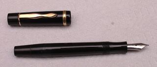 Photo of a pen produced by Montblanc marked "Meisterstück". Model: Montblanc 134. Filling system: piston filler. In black celluloid. Standard wartime version with steel nib.