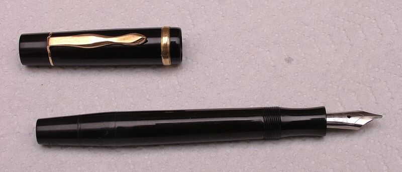 Foto di una penna Montblanc marcata "Meisterstück". Modello: Montblanc 134. Caricamento a stantuffo. Realizzazione in celluloide nera. Versione standard del tempo di guerra con pennino in acciaio. Contributo di Massimo (utente forum maxpop55).