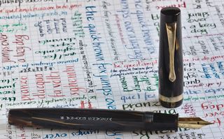 Foto di una penna Morans. Caricamento a pulsante di fondo. Realizzazione in celluloide striata marrone. Pennino n. 8 dorato.