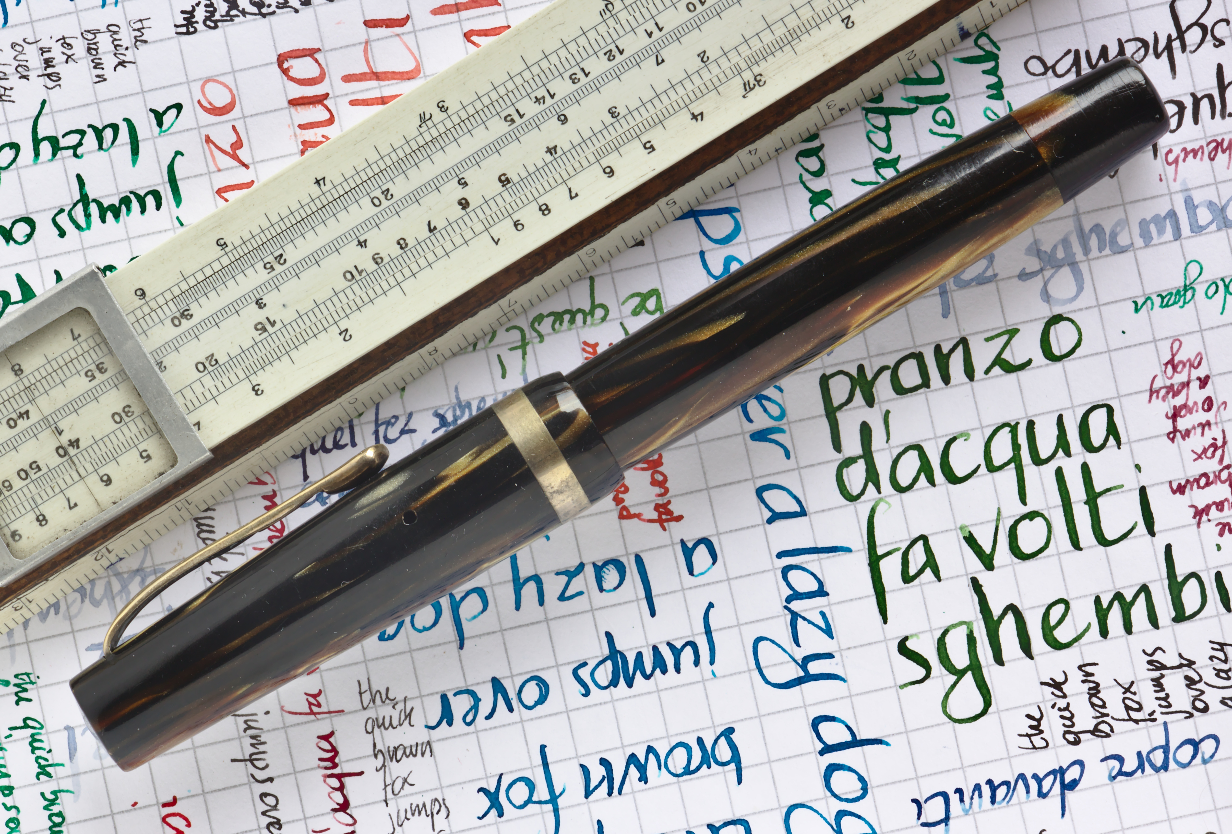 Foto di una penna Morans. Caricamento a pulsante di fondo. Realizzazione in celluloide striata marrone. Pennino n. 8 dorato.
