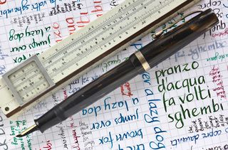 Foto di una penna Morans. Caricamento a pulsante di fondo. Realizzazione in celluloide striata marrone. Pennino n. 8 dorato.