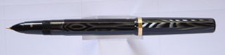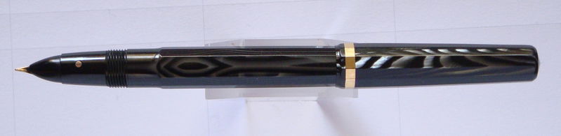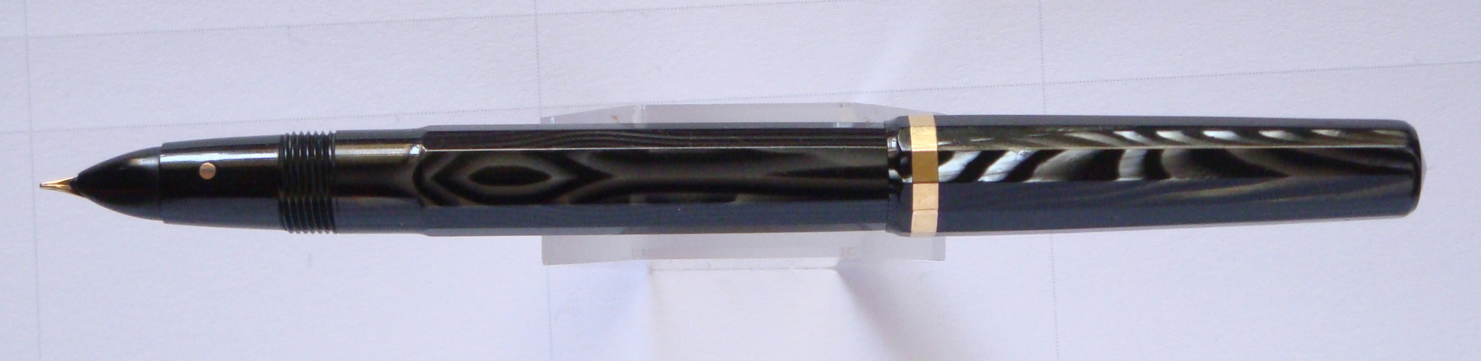 Foto di una penna Omas. Modello: Omas 361/F. Caricamento a stantuffo. Realizzazione in celluloide "arco" grigia. Versione faccettata, misura piccola. Contributo di Roberto Vetrugno (utente forum.fountainpen.it roberto v).