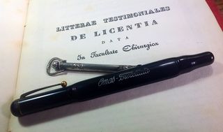 Foto di una penna Omas. Modello: Penna del dottore. Caricamento a levetta. Realizzazione in ebanite nera. Modello molto raro, provvisto di scomparto per il termometro. Misura grande. Contributo di Massimo, utente forum Maxpen2012.
