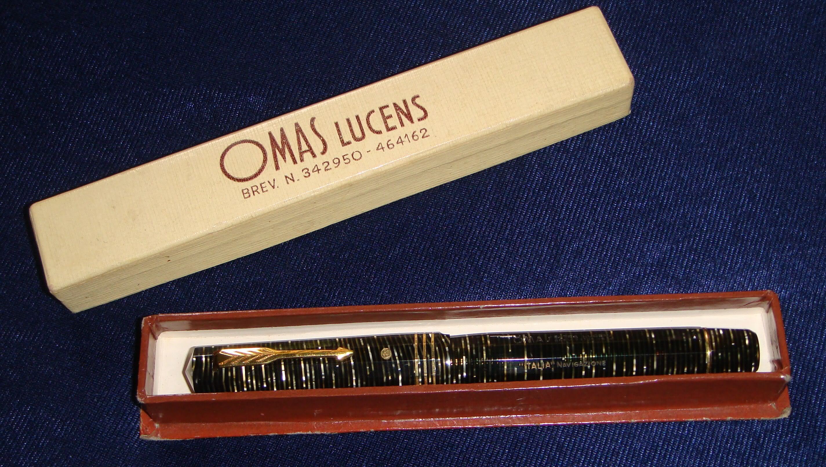 Foto di una penna Omas marcata "Italia Navigazione". Modello: Extra Lucens. Caricamento a stantuffo tuffante. Realizzazione in celluloide anellata grigia. Misura media. Versione con tre anellini, finiture dorate. Riporta stampigliato il brevetto nº IT-73725-1936. Scatola che riporta i brevetti nº IT-342950 e nº IT-464162. Contributo di Roberto Vetrugno (utente forum.fountainpen.it roberto v).