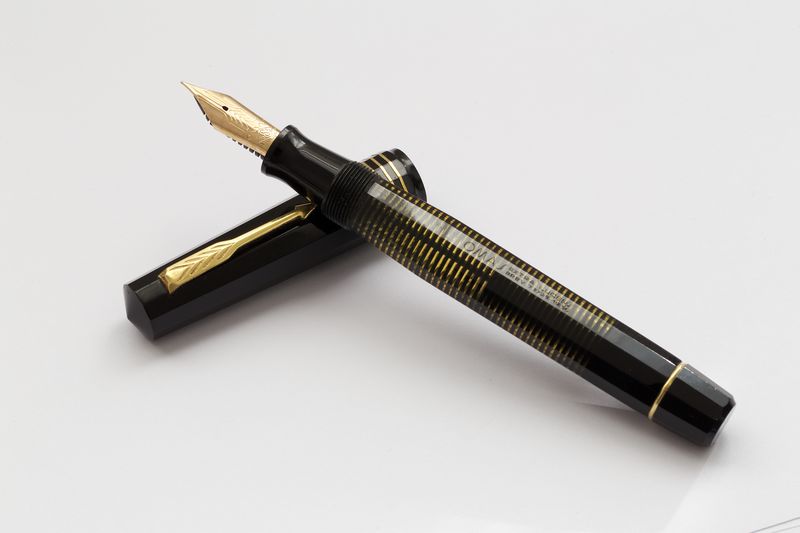 Foto di una penna Omas. Modello: Extra Lucens. Caricamento a stantuffo tuffante. Realizzazione in celluloide nera anellata. Misura grande. Versione con tre anellini, finiture dorate. Trasparenza gialla. Riporta stampigliato il brevetto nº IT-73725-1936. Contributo di Luca (utente forum LucaC).