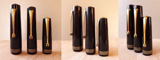 Photo of a series of pens produced by Omas. Model: Lucens. Filling system: "stantuffo tuffante". In spiraled black celluloid. Detail of cap. Three thin ring version. Big, standard and small sizes. There is the imprint of nº IT-73725-1936 patent.