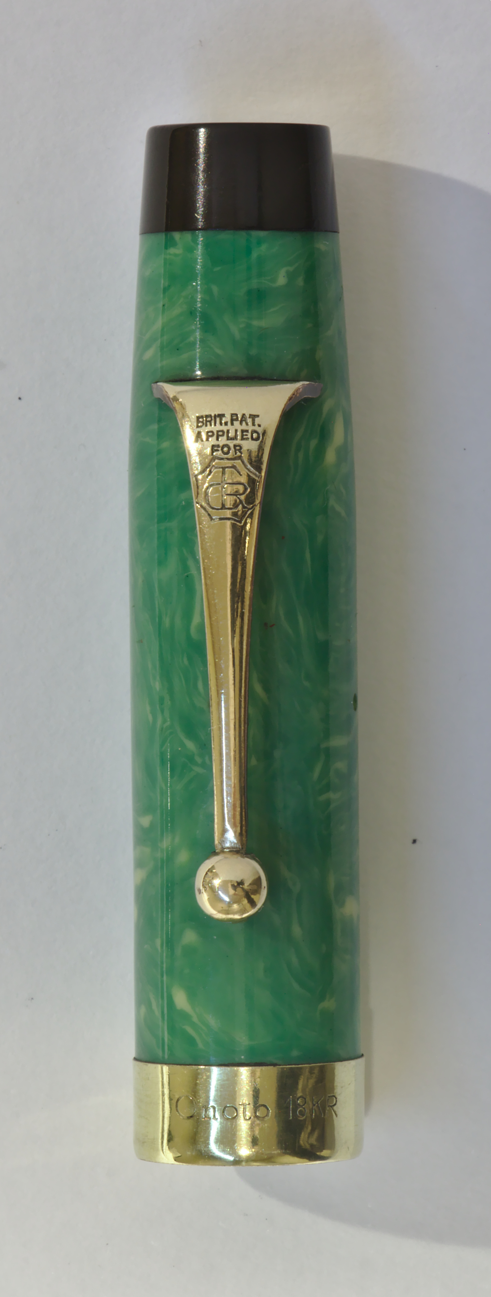 Photo of a pen produced by Onoto. Model: Onoto 1740. Filling system: lever filler. In jade green celluloid. Detail of cap. Large pen, numbered 72 on the side on the back. Courtesy of Guglielmo Garlato. Photographed at 2019 Bruxelles Pen Show.