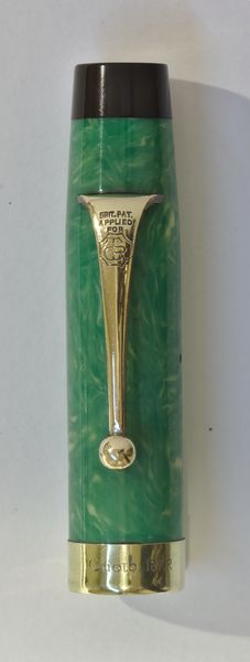 Foto di una penna Onoto. Modello: Onoto 1740. Caricamento a levetta. Realizzazione in celluloide verde giada. Dettaglio del cappuccio. Penna di grosse dimensioni, numerata 72 lateralmente sul fondello. Messa a disposizione da Guglielmo Garlato. Fotografata al Pen Show di Bruxelles del 2019.