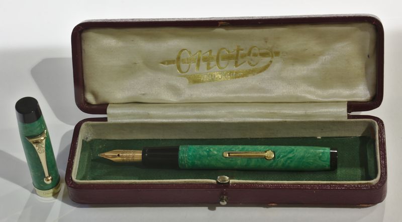 Photo of a pen produced by Onoto. Model: Onoto 1740. Filling system: lever filler. In jade green celluloid. Large pen, numbered 72 on the side on the back. Courtesy of Guglielmo Garlato. Photographed at 2019 Bruxelles Pen Show.