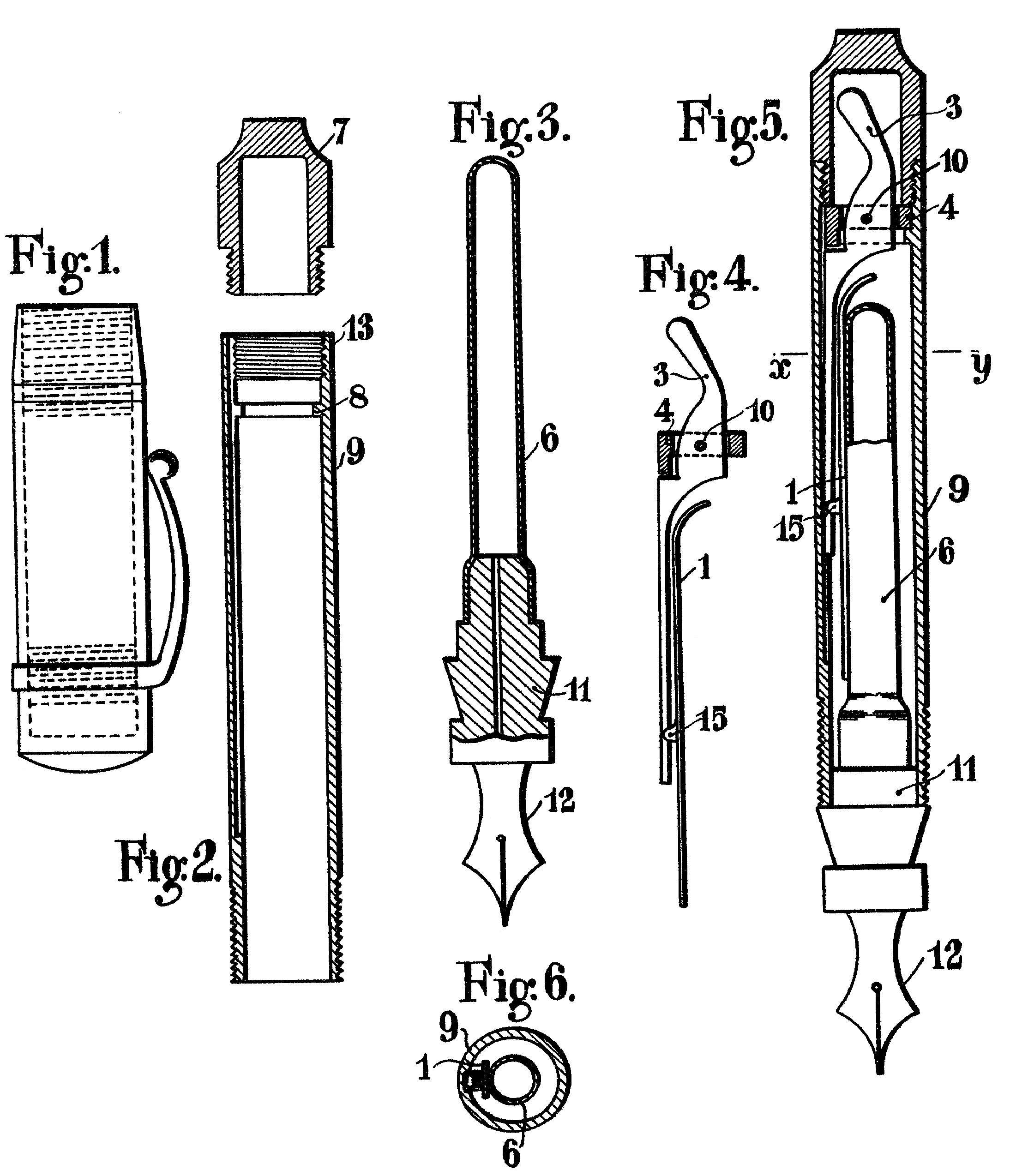 <multilang> @it|Schema del sistema di caricamento a cucchiaio usato dalla Columbus (inventore Eugenio Verga, assegnatario la Mabie Todd and Company). Estratto dalla sesta pagina del brevetto originale (nº CA-327288). Ritoccato dall'autore per una maggiore nitidezza. @en|Schema of the Columbus spoon filler (inventor Eugenio Verga, applicant Mabie Todd and Company). Excerpt from original patent (nº CA-327288) sixth page. Retouched by the author for a better sharpness. </multilang>
