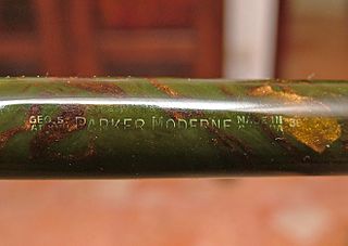 Photo of a pen produced by Parker. Model: Parker Moderne. Filling system: button filler. In green with bronze celluloid. Detail of inscription. A model belonging to the class of pens called by collectors "Depression era pen".