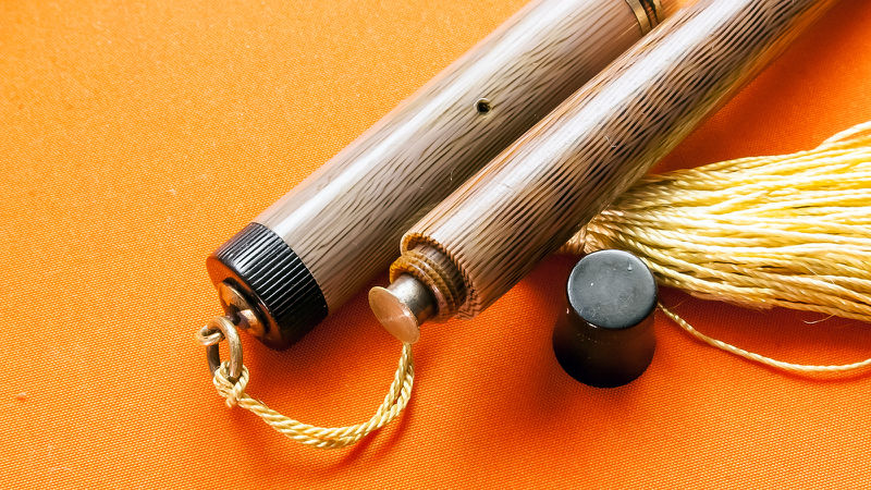Photo of a pen produced by Parker. Model: Pastels. Filling system: button filler. In moire light brown (Beige Gray) celluloid. Lady version with cap ring and band in black with external gold rings. There is an imprint on the body referring to patent nº US-990288.