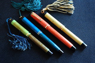 Photo of a series of pens produced by Parker. Model: Pastels. Filling system: button filler. In celluloid. Different colors and version serie.