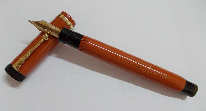 Photo of a pen produced by Parker. Model: Duofold. Filling system: button filler. In Orange Red celluloid. Big size ("Big Red").