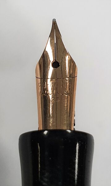 Photo of a pen produced by Parker. Model: Parkette. Filling system: lever filler. In marbled green celluloid. Detail of nib. Type 3b, made in USA, golden steel nib No. 25.