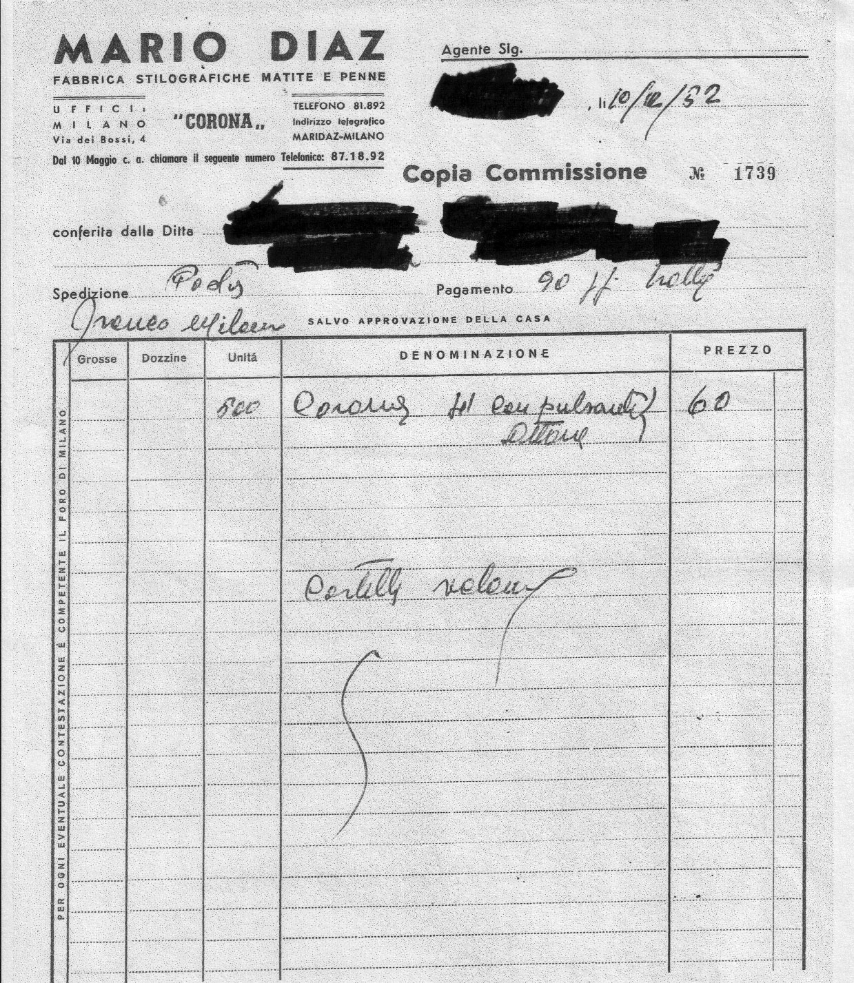 <multilang> @it|Scansione di un ordine di penne Corona di Mario Diaz del Dicembre 1952. @en|Scanning of a December 1952 order for pens of the Mario Diaz Corona's brand. </multilang>