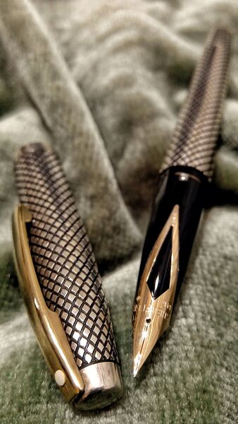 Photo of a pen produced by Sheaffer. Model: Sheaffer Imperial. Filling system: Touch Down. With diamond pattern engraving sterling silver overlay. Luxury sterling version.